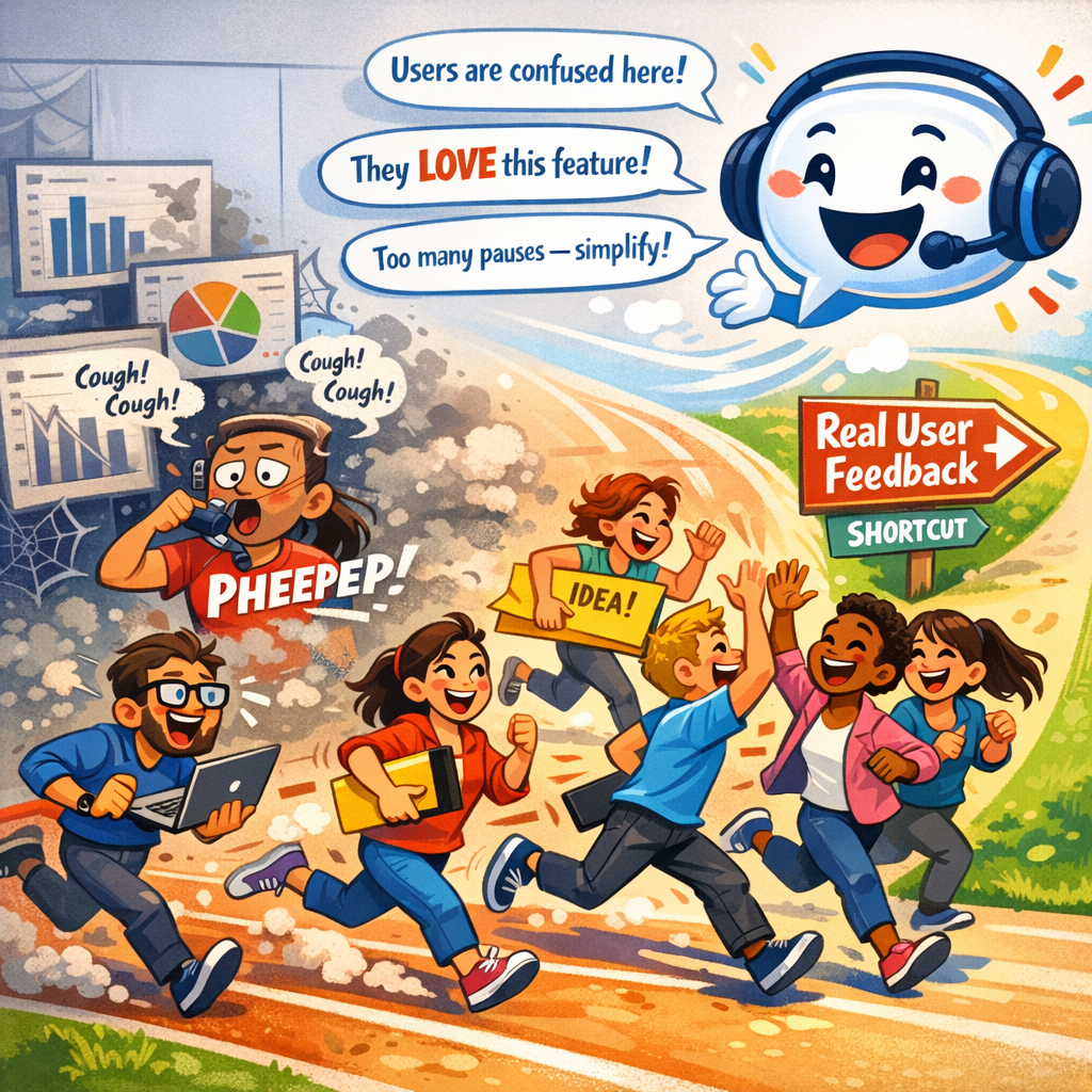 Imagine a product team sprinting ahead — developers coding, designers adjusting, marketers polishing the story — all racing toward a release date like runners in a relay. Everyone’s watching metrics, dashboards, ticket counts, burn down charts… but something crucial is missing. The loudest signal of all: what real humans actually say when they use your product